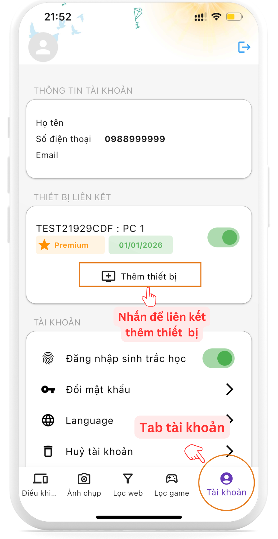 - Bạn có thể thêm nhiều thiết bị vào tài khoản của mình để quản lý từ ứng dụng KidSafe Admin.