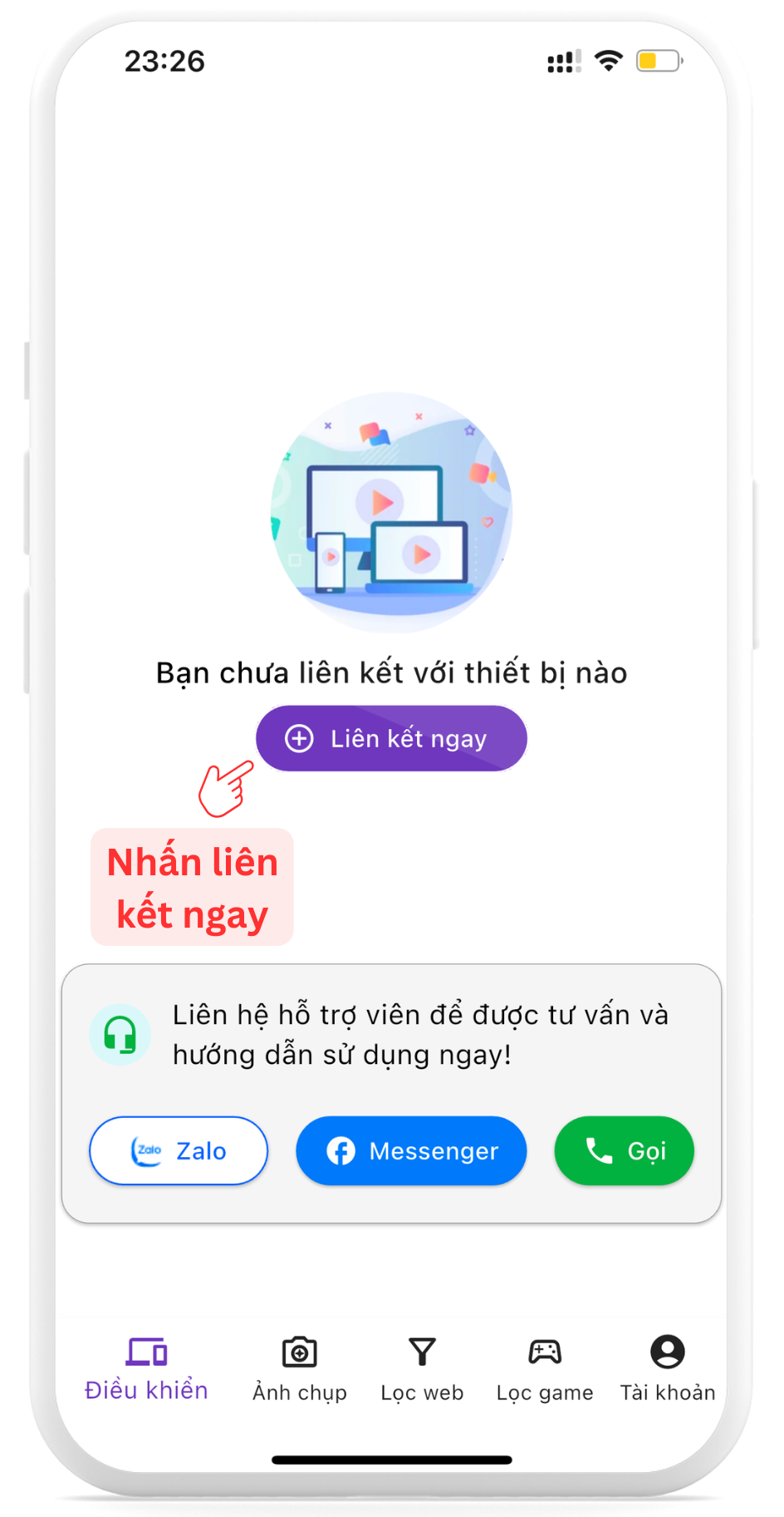 Ở màn hình điều khiển nhấn vào nút “Liên kết ngay”.